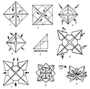 Спочатку намічаються діагоналі. Для цього необхідно скласти аркуш паперу навпіл два рази. Потім кожен кут паперового аркуша потрібно підігнути до центру — виходить маленький квадрат. Кути отриманого квадрата необхідно знову підігніть. Третій раз необхідно повторити ті ж дії. Потім вийшов квадрат перевертається лицьовою стороною вниз, і знову кути паперового квадрата підгинаються.