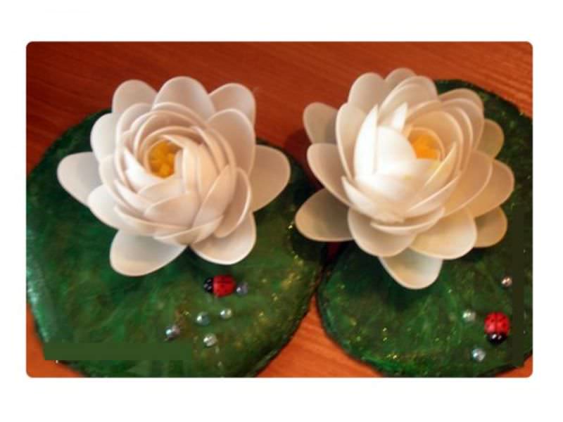 Можна доповнити водяну лілію зеленими пелюстками. Для цього достатньо склеїти два паперових кувшинчика різного кольору. На відміну від справжньої водяний, лілія паперова не зів’яне і завжди буде радувати вас своїм виглядом.