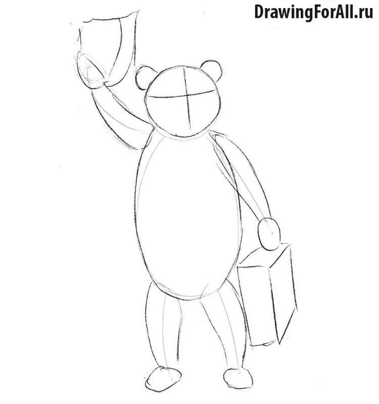 Щоб вийшов гарний малюнок, ведмідь на ньому виглядав реалістично, важливо прорахувати пропорції тулуба тварини. Для цього спершу прорисуйте основні лінії тулуба та голови, потім нанесіть перші обриси і лише потім приступайте до дрібних деталей. Пропонуємо в добірці подивитися, як покроково створити малюнок ведмедя для дітей.