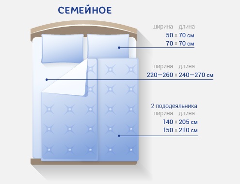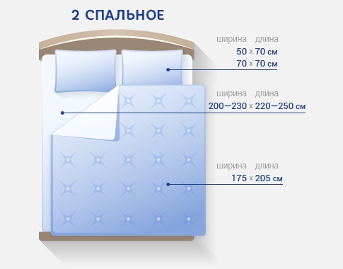 | Двоспальне | 175х210; 175х215; 210х230; 220х215; 240х260; 220х220. | 180х210; 180х215; 200х220. | 50х70; 70х70; 60х60. |