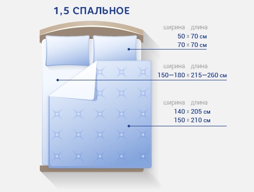 | Односпальне або півтораспальне | 160х210; 150х215; 180х260; 215х148. | 150х210; 150х215; 150х220; 215х248. | 50х70; 70х70; 60х60. |