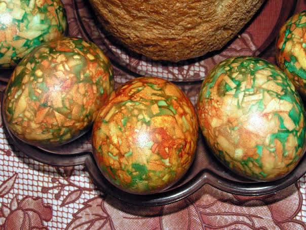 - Щоб поєднати декілька відтінків, можна використовувати при фарбуванні лушпиння різних сортів цибулі – білого і червоного. Того ж ефекту допоможе домогтися з’єднання лушпиння з паперовими обривками.