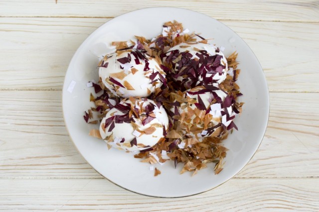 Яйця відварити в чистій воді, після чого трохи надломити шкаралупу, щоб з’явилися тріщини. Можна акуратно стиснути яйце в руках. Важливо не перестаратися, інакше оболонка відпаде зовсім. Потрібно, щоб вона трималася на внутрішній тонкої плівочці.