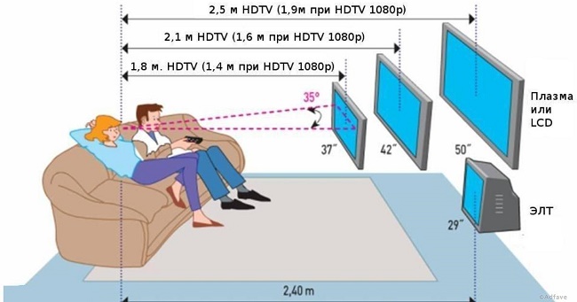 В залежності від призначення кімнати, її габаритів і висоти меблів телевізор встановлюється на відстані від 1 до 1,6 м від підлоги. При цьому кут від центру екрана до очей не повинен перевищувати 30 градусів.