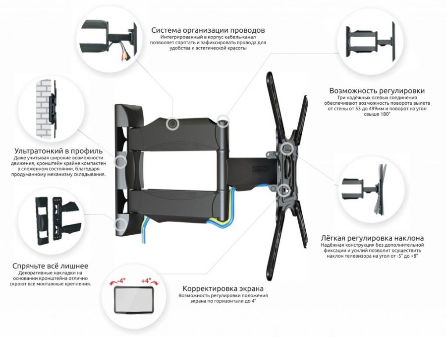 З допомогою певних моделей кронштейнів можна не тільки прикріпити телевізор до стіни, але і повертати його в різних напрямках. Наприклад: