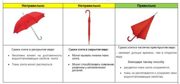 Ні в якому разі не слід залишати мокрий парасольку в складеному вигляді. З-за цього може початися загнивання тканини, і виріб буде безнадійно зіпсовано.