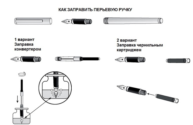 Пір’яну ручку можна заправити кількома способами. Розглянемо докладніше варіанти заправки, враховуючи особливості конструкції.