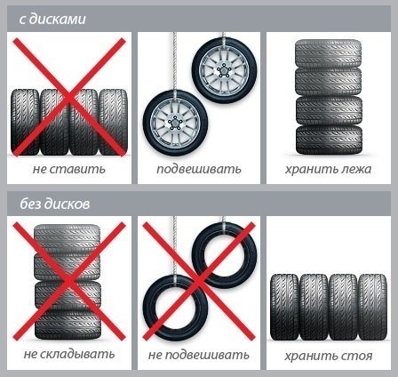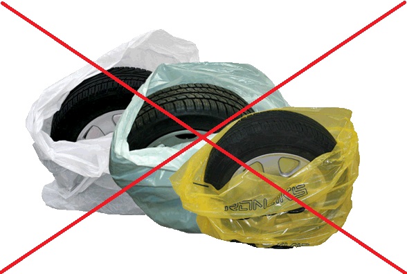 Не укладайте шини в поліетиленові пакети, так як з часом всередині може утворитися конденсат, який негативно вплине на гуму і може викликати корозію дисків.
