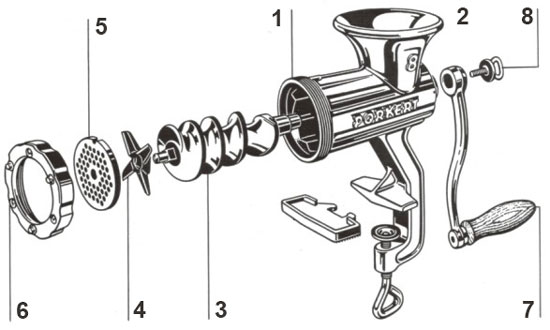 Щоб правильно зібрати механічну м’ясорубку потрібно знати її конструкцію і розуміти, як виглядають її складові елементи.