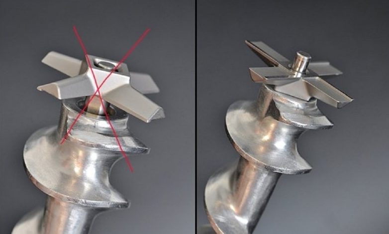 Якщо ніж у приладу з однією ріжучою стороною, встановіть його гострою частиною до шнека. Таким чином, плоска частина ножа виявиться зовні і буде плавно ковзати по решітці.