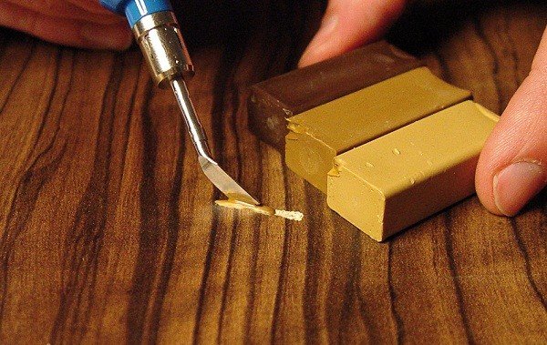 - Твердий меблевий віск. Для роботи з таким видом складу бажані певні навички. Він більш стійкий, але і більш дорогий. Перед тим як закрити пошкодження, віск слід розплавити. Потім їм потрібно обробити подряпину і зону навколо неї. Чекаємо, поки віск висохне, це відбувається досить швидко, близько хвилини, і добре відшліфовуємо цю ділянку.