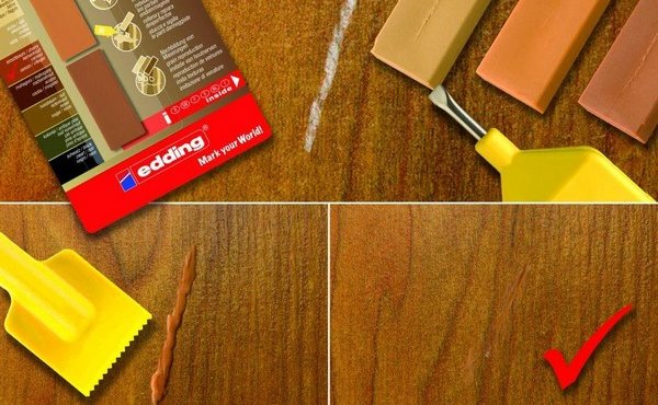 - М’який меблевий віск. Меблевим воском натирають подряпини. У разі досить великих розмірів пошкодження, їх закладають, використовуючи шпатель або лезо ножа. Після цього залишаємо засіб на 15 хвилин, а потім прибираємо залишки. Відполіруйте поверхню, застосовуючи бавовняну тканину.