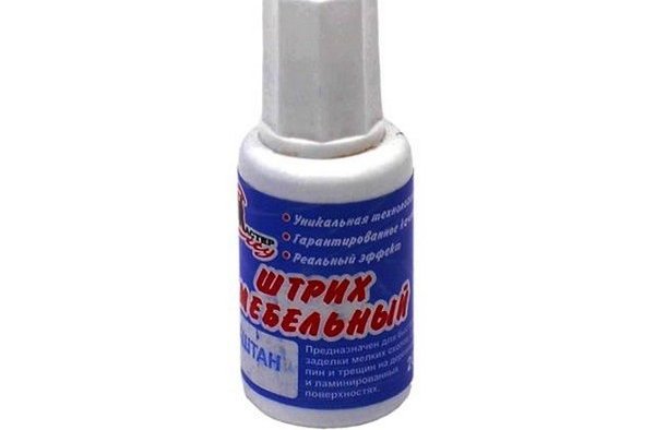 - Меблевий штрих. Цей засіб можна знайти в магазинах, де продається гарнітура для меблів. Перед застосуванням флакон добре збовтайте. Потім, використовуючи пензлик, нанесіть 2-3 шару на пошкоджену ділянку. Після повного висихання протріть оброблене місце тканинною серветкою, змоченою у воді.
