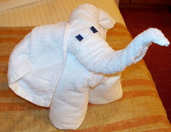 Дитину ви зможете порадувати, якщо створите з рушники смішну і оригінальну фігурку тварини. Заздалегідь поцікавтеся у батьків, який у малюка улюблений герой мультфільму, і підготуйте сюрприз, склавши рушник в такій формі.