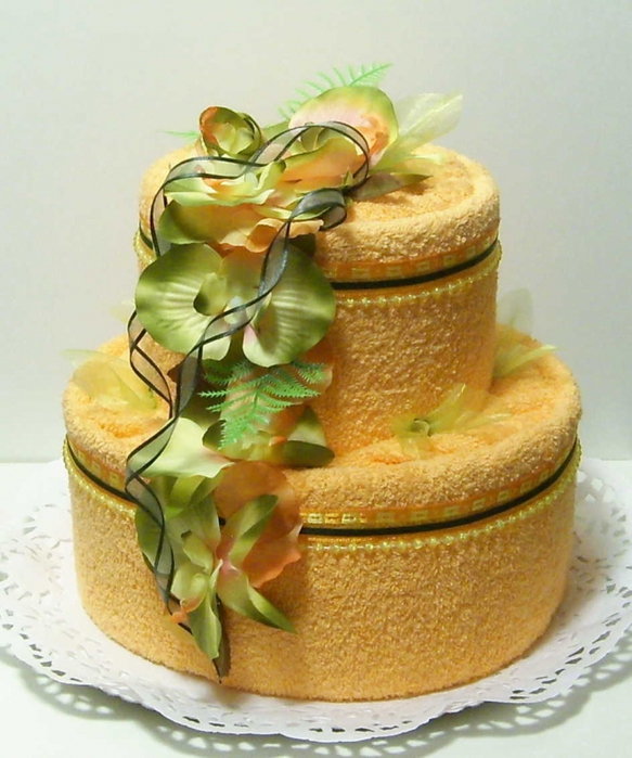 Для створення великого двох’ярусного торта вам буде потрібно 4 однакових прямокутних рушники, гумки для скріплення, та підстава з картону. Для прикраси композиції також підготуйте кілька мереживних паперових серветок, декоративну стрічку, банти або штучні квіти.