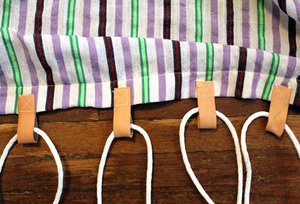 - на торцях гамака строчать лаштунки для поперечин, відступивши від краю на 5 см, потім у них вставляють пофарбовані планки, формуючи по довжині рівномірні складання;