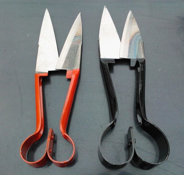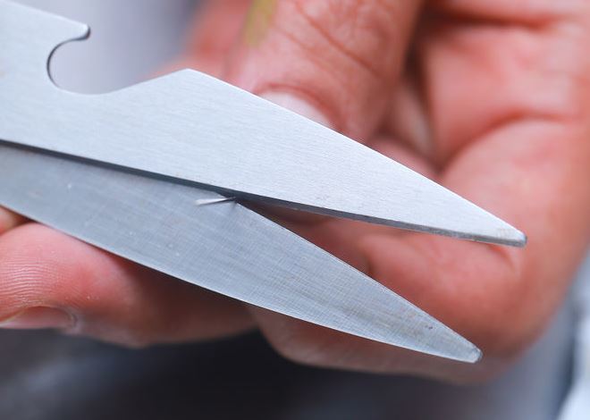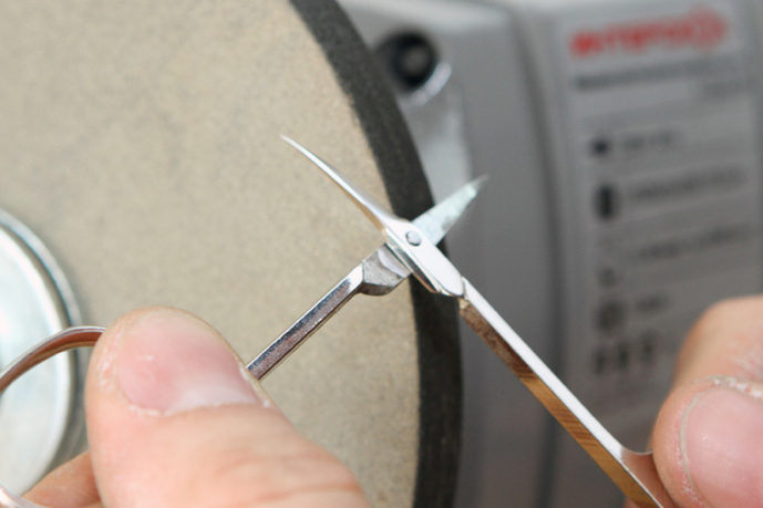 Подібні ножиці вимагають максимальної гостроти, тому обробка фольгою або наждачкою не підійде. Точити леза необхідно за допомогою верстата з абразивним кругом. Кожне лезо обробляйте окремо, розкривши половинки як можна ширше.