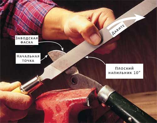 Обробіть кожне лезо з внутрішньої сторони напилком під кутом від 70 до 80 градусів. Рухи виконуйте або тільки від себе або до себе. Ні в якому разі не запиливайте леза ривками вперед — назад. Для загострювання достатньо всього декількох рухів.