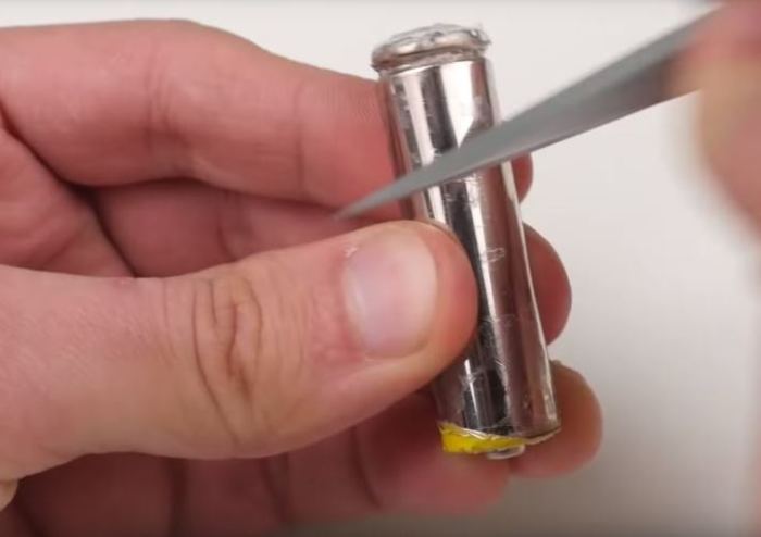 Аналогічним скріпки способом можна заточити ножиці з допомогою непотрібної пальчикової батарейки. Зверніть увагу, що акумулятор повинен бути обов’язково в металевому кожусі. Затисніть батарейку лезами і проведи до підстави необхідну кількість разів.