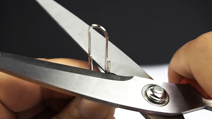 Скріпку міцно затисніть кінчиками лез і повільно, тримаючи ножиці пальцями, проведіть до підстави. Повторюйте процедуру, поки ножиці не стануть досить гострими. Ви зрозумієте, що ножиці точаться, помітивши дрібні зазубрені на скріпці.