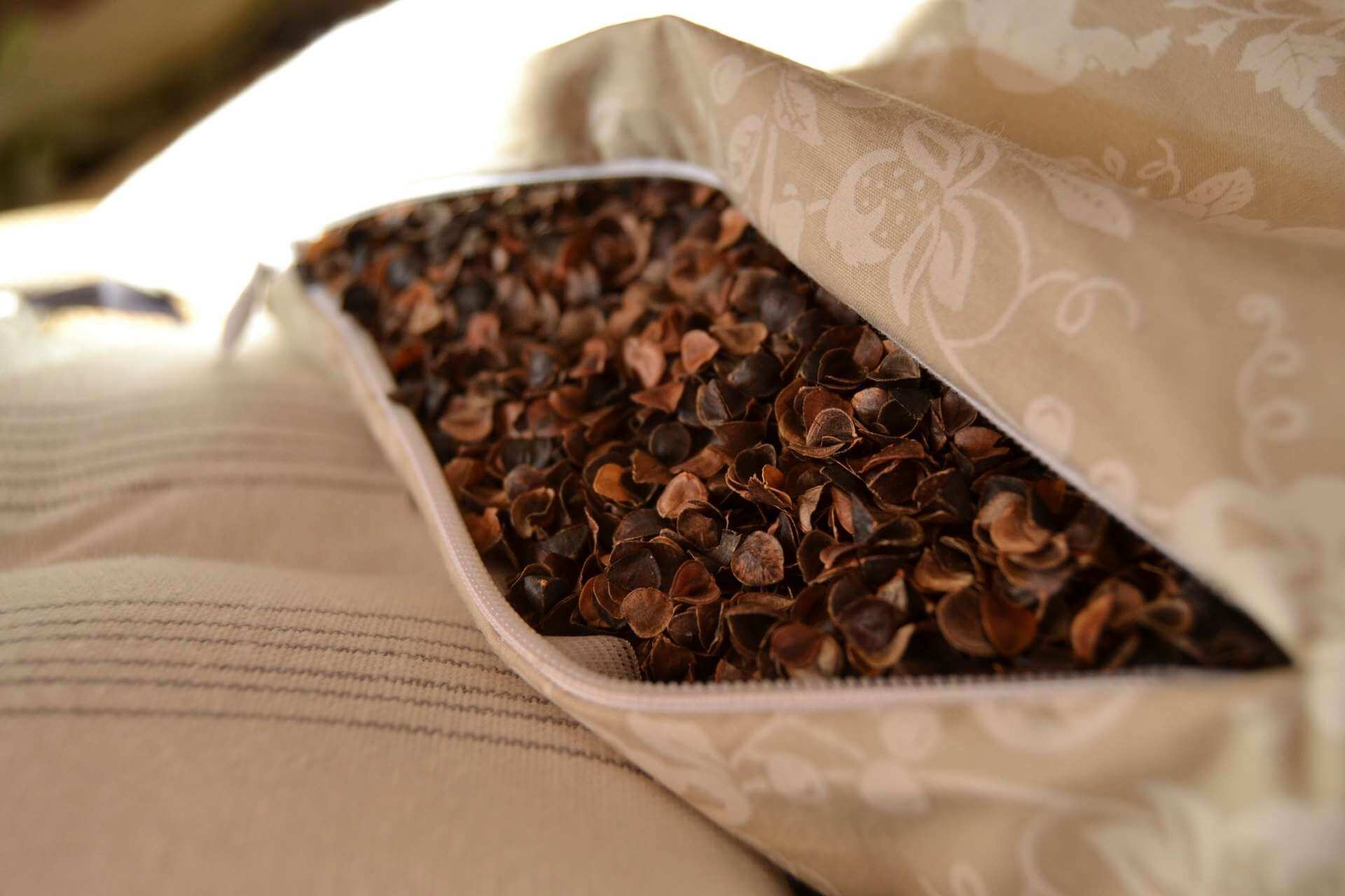- Гречана лузга. В процесі добування зерна залишаються порожні гречані оболонки, які використовують в якості натуральних наповнювачів. Матеріал стійкий до появи кліщів, приймає форму контурів тіла. Ідеальний варіант, коли треба вирівняти хребет і стежити за правильною поставою.