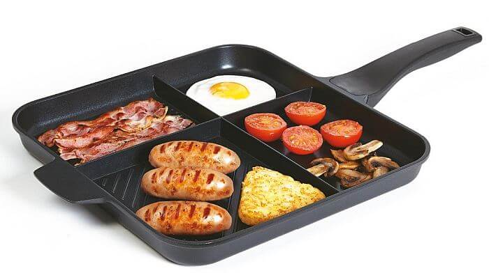 В даних сковородах одне відділення має ребра, а інше відділення оснащене гладкою поверхнею. Оптимальним варіантом вважається квадратна сковорода, так як підходить для більшої кількості страв.