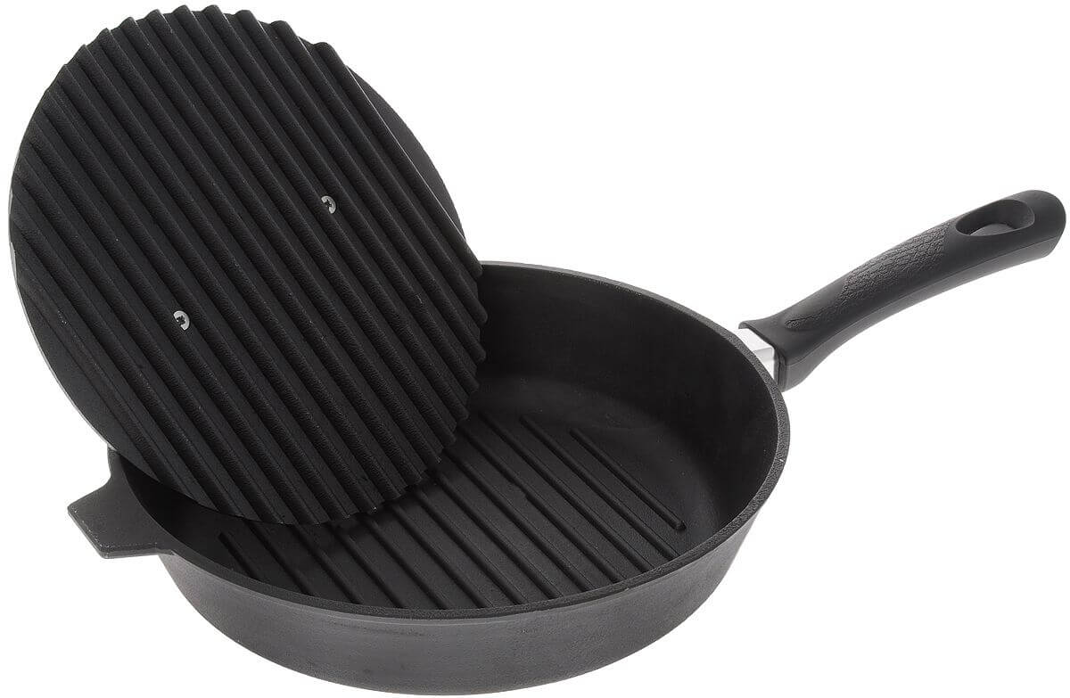 Преси для сковорідок гриль так само оснащені ребрами, як і сама сковорода. Залежно від страв, які будуть готуватися, варто орієнтуватися, з якого металу купувати сковороду – алюміній або чавун, адже один з них важче, а другий легше.