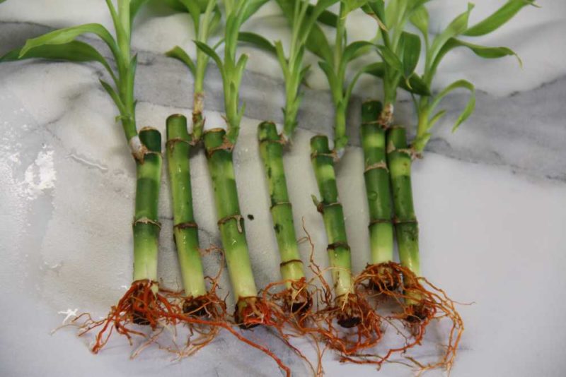 Рада! У ємності з бамбуком потрібно підтримувати невисокий рівень води, тільки щоб були закриті коріння, якщо у воді буде знаходитися стовбур, то на цій відстані будуть з’являтися корінці, що виглядає не естетично.