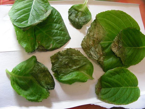 Насамперед варто дивитися на стебло. Він повинен бути щільним, пружним, мати дорогий зелене забарвлення. На листах не повинно бути коричневих або жовтих утворень. Вони повинні бути соковитими і яскраво-зеленими. Якщо листя гортензії мляві, по краях сохнуть або ж на них розташовані білі або жовті плями, від покупки варто відмовитися.