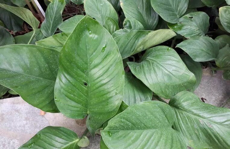 Здатна досягати висоти 8 метрів. Листя овальної форми, злегка загострені до зовнішнього краю, довжиною від 20 до 55 сантиметрів і шириною від 15 до 40 сантиметрів, покриті дірочками. Покривало качана при цвітінні має жовтуватий відтінок.