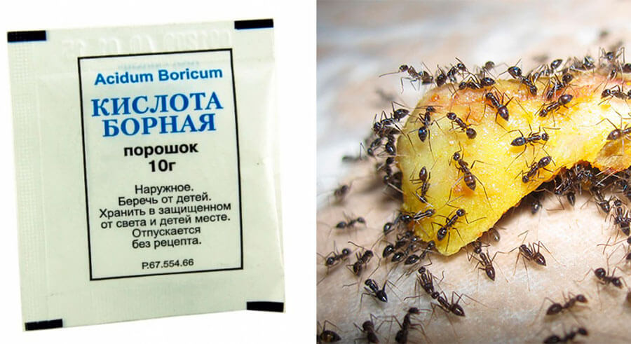 Борна кислота проявила себе як дієвий засіб для знищення мурах. Ви можете використовувати речовину в чистому вигляді, розсипавши в місцях скупчення мурашок, так і приготувавши ароматні принади, для подальшого транспортування мурахами-постачальниками отрути в гніздо. Засіб працює як в квартирах чи будинках, так і на відкритому повітрі, наприклад, в саду або городі.