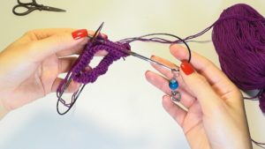 Далі потрібно набрати розрахункова кількість петель на спиці з ліскою — це робиться так само, як і для прямого в’язання. Потім перший ряд провязывается лицьовими, а потім замикається в коло — точно так само, як і при в’язанні на п’яти спицях, тобто потрібно просто продовжувати в’язати, не перевертаючи роботу. І з другого ряду перейти на гумку, в’язати її на висоту коміра. Зайву волосінь просто витягуємо між петель за межі кола. І робимо це періодично, як тільки стає незручно в’язати. За межами роботи у вас просто виходить петля з волосіні, яка переміщається з місця на місце.