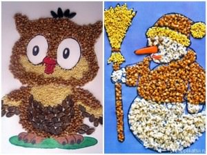 Абсолютно точно, на кухні у кожної жінки є великий вибір різних круп і насіння, за допомогою яких можна просто зробити своїми руками цікаві вироби з дитиною. Підійде такий вид роботи, як аплікація з їжі, для дітей всіх вікових категорій, навіть починаючи з п’яти років. З самими маленькими дітьми у віці від п’яти чотирьох або п’яти років, можна разом зробити звичайні картинки в стилі «Сонце», «Грибок», «Квітка», 6-7 — Каша на тарілці, Горобина, Три ведмедя.