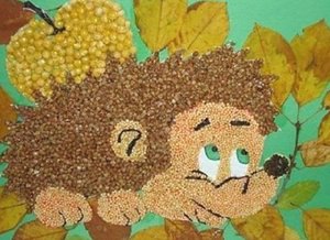 Колючу спину ми будемо робити з гречки, а живіт і обличчя з пшона, для зображення яблучка піде сухий горох, насіння або червона сочевиця. На щільному картончике потрібного кольору намалюємо контури їжака. Промаж контури колючим спинки клеєм і посиплемо добре гречкою. Почекаємо кілька хвилин, і перегорнемо картинку, щоб непотрібні зерна випали. Те ж саме зробимо з мордочкою їжака. Намажемо контури яблука і по одному приклеїмо зернятка гороху плоскої сторонкою вниз. Фон допоміжно можна обігравати сухим листям. От у нас і вийшов лісовий їжачок.