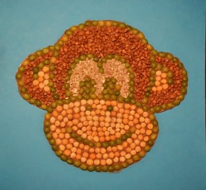 На картоні зобразимо або переведемо картинку. Можна приклеїти вирізаний малюнок з розмальовки. Намажемо клеєм по контуру нашої картинки і посипаємо цей клаптик крупою, зайве приберемо. Насіння, горох приклеїмо по частинах. Щоб робота довше була в цілості й схоронності, наносимо на неї лак для волосся.