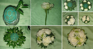 Підстава можна прикрасити листям або атласною стрічкою. Оформлення необхідно починати з великих бутонів. Квіти повинні щільно прилягати один до одного. Проміжки заповнюються дрібними бутончиками і листочками. При бажанні букет прикрашений намистинами, стразами і іншими елементами.