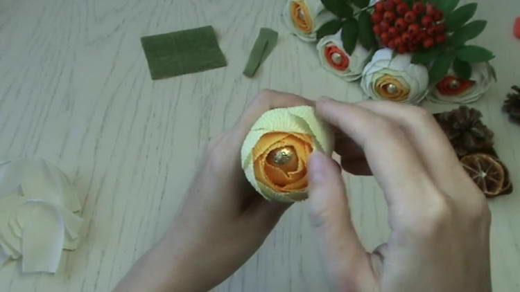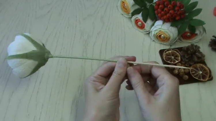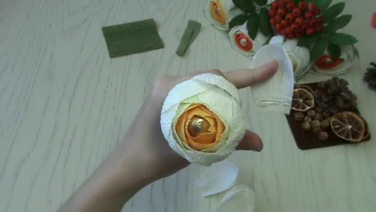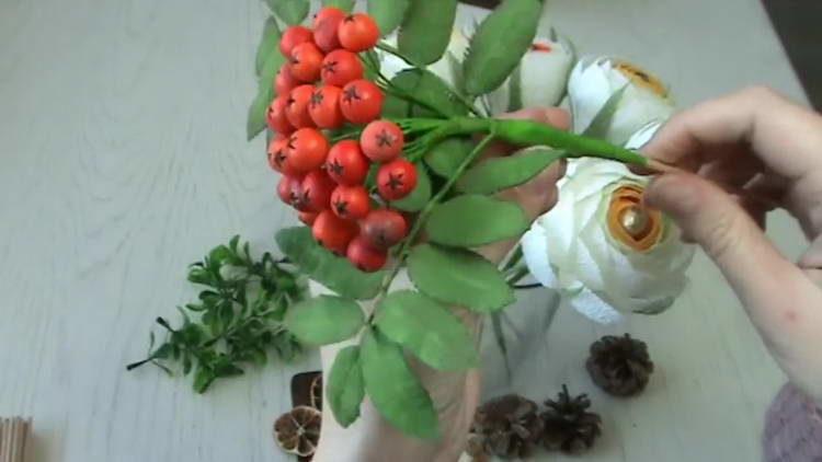 - Додаємо в цей шикарний букет осінніх троянд гроно горобини, зроблену з термоклея.