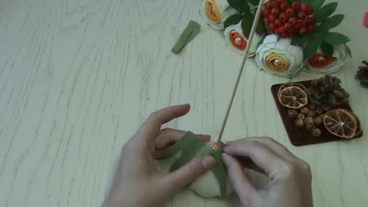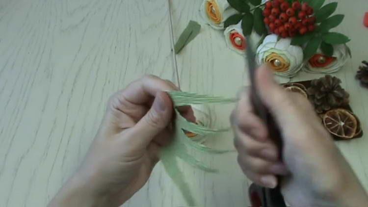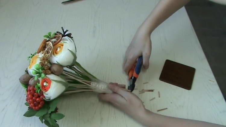 - Таким же чином підклеюємо на дріт приблизно штук 20 завитків з апельсинової цедри, тільки дріт бажано взяти тонший. Завитки на дроті скручуємо по кілька штук разом, щоб вони не загубилися в букеті.