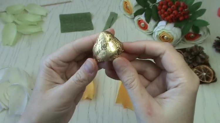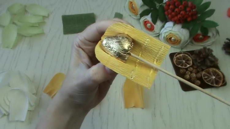 - Клейовим пістолетом наносимо 2 смужки клею на пелюстки знизу і обертаємо цієї папером цукерку, клеєм приклеюючи до шпазі.