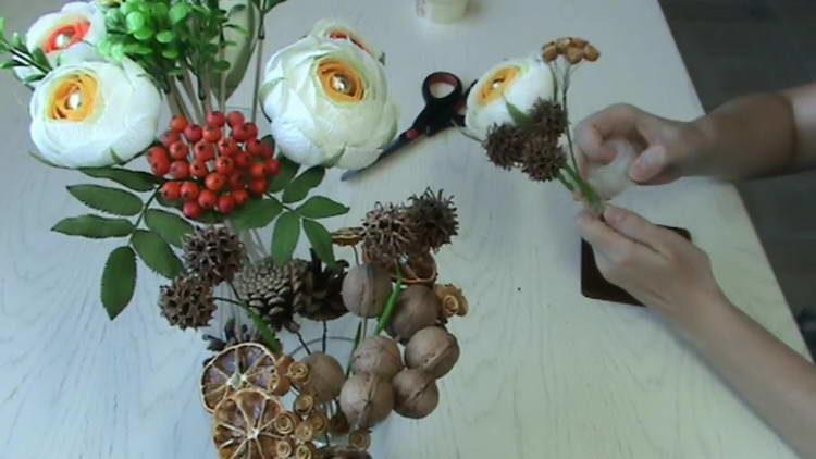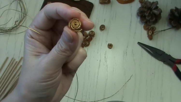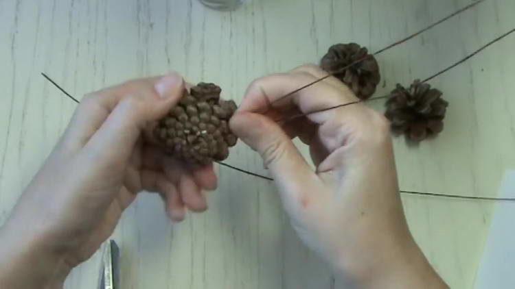 - З 5 шишок теж зробимо своєрідні квіти. Для цього кожну шишку обертаємо двома шматочками дроту сантиметрів по 20 і скручуємо в одну ніжку.