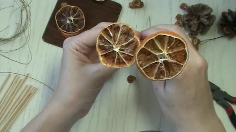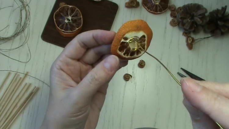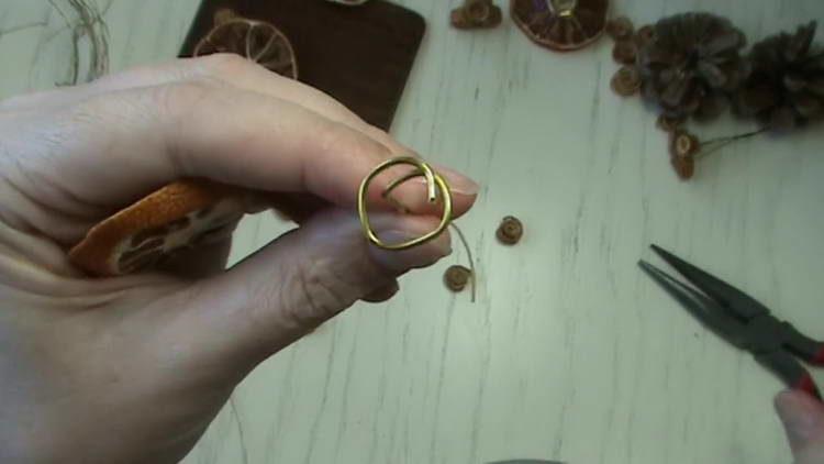 - З флористичної товстого дроту робимо ніжку для засушеного апельсина. Для цього шматочок дроту довжиною приблизно 15 см скручуємо з одного кінця в колечко.