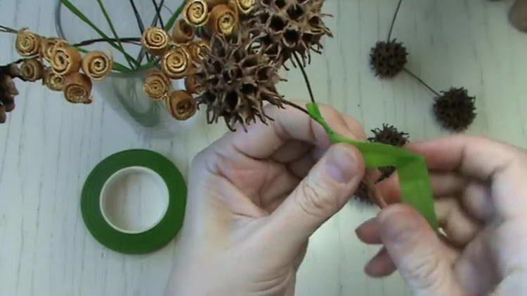 - Беремо 7 колючих кульок ліквідамбара, їх також обертаємо дротом і скручуємо ніжки. З’єднуємо по кілька штук, закріплюємо тейп-стрічкою на дерев’яні шпажки.