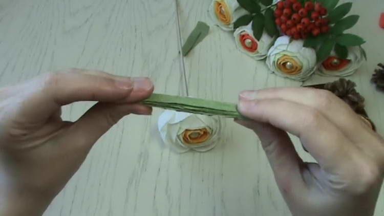 - Смужку з темно-зеленої гофробумаги обертаємо навколо шпажки, завдавши на неї клей.