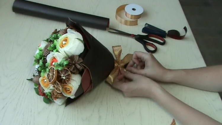 На відео показаний майстер клас: букет з цукерок своїми руками (покрокове фото якого подано вище) в осінньому стилі, він послужить відмінним подарунком для дитини вчителі в день 1 вересня. Особливо корисний такий відеоурок для початківців майстринь.