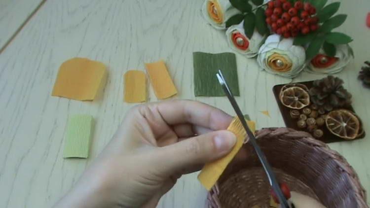 - Вирізаємо ножицями з жовтою гофрованого паперу 2 прямокутника розміром 5х7 см (пелюстки).