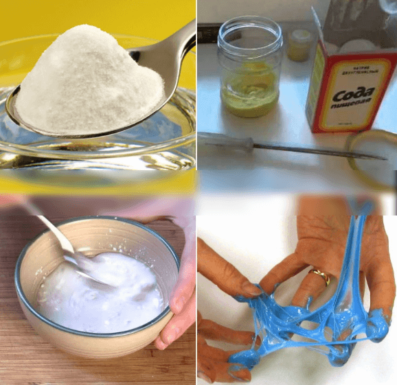 - Перемішати в пластиковій тарі однакову кількість шампуню для волосся, соди і води. Можна додати будь-який барвник або залишити лизуна білосніжним. Зберігати його потрібно в целофановому пакеті.