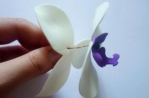 Коли все що потрібно підготували, треба приступити до складання орхідеї. Користуватися ви можете шматочками вушної палички (самої ваточки) або купленої пластмасової тичинкою, а краще, для більш гарного вигляду, використовувати звичайну намистину, призначену для біжутерії. Для складання квітів необхідна дріт, яку можна купити в магазині товарів для рукоділля (продаються в мотках). Протягуємо намистини до єдиного центру і скручуємо дріт джгутом.