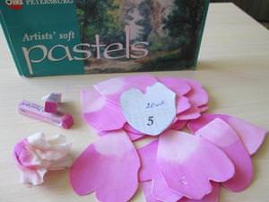 Пелюстки півонії з номером п’ять, офарблюємо блідо-рожевим відтінком повністю з обох сторін, потім верх пелюсточки з двох сторін яскраво-рожевим, знизу залишимо два сантиметри. Пелюстки з номером три тонуємо світло-рожевим відтінком повністю з двох сторін, потім верх пелюстки з двох сторінок яскраво-рожевим, при цьому якісно розтушовуючи пастель. Граємо з уявою, кожна пелюстка тонуємо по-різному.