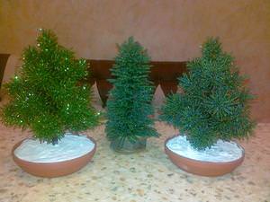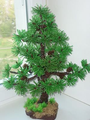 Дуже красиво виглядає як би припорошенная снігом зимова сосна. Для її виготовлення зелений бісер потрібно комбінувати з білим, розташовуючи білі бісеринки на кінчику соснової голочки.