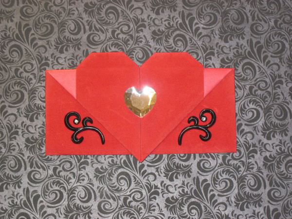 Гарний об’ємний конверт у вигляді серця можна зробити з легкістю в домашніх умовах. Оригінальне оформлення цієї конструкції відразу ж привертає увагу. Виглядає такий конвертик святково і презентабельно.